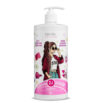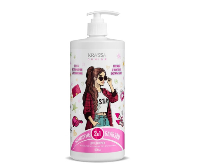 | Наименование | Шампунь + бальзам 2 в 1 для девочек KRASSA JUNIOR с пантенолом 900мл 2914 |