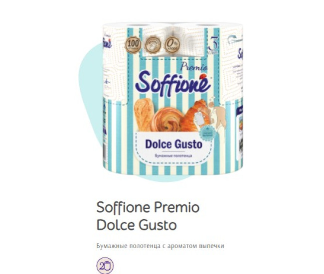 | Наименование | Полотенце бумажное SOFFIONE Premio Dolce Gusto с ароматом выпечки 3слоя 2 рулона*14 3298 |