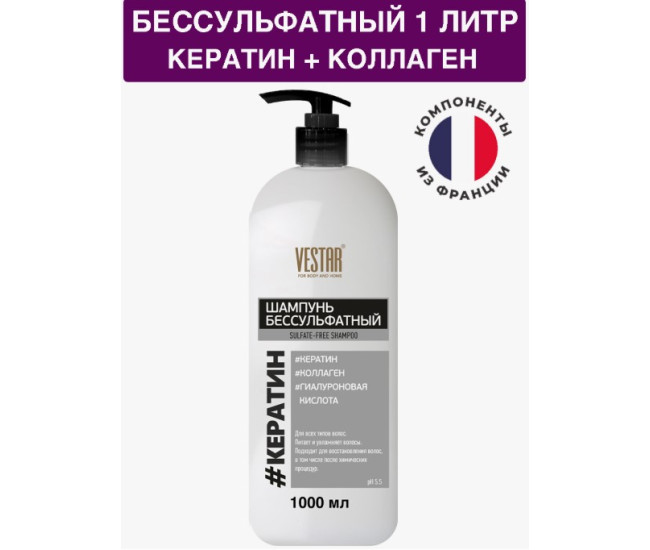 Шампунь VESTAR 1000мл Бессульфатный Кератин Коллаген флакон*6 7351