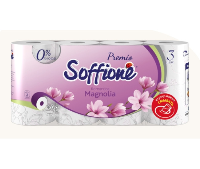 | Наименование | Туалетная бумага SOFFIONE Premio 3слоя 8 рул Pr.Romantica Magnolia *5 2222 |