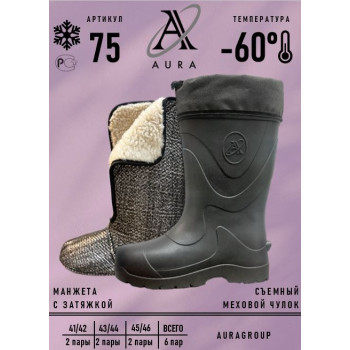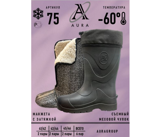 | Наименование | Сапоги муж Рыбацкие Аура №75 утеплен -60 41/42-45/46 (прод по 6) |