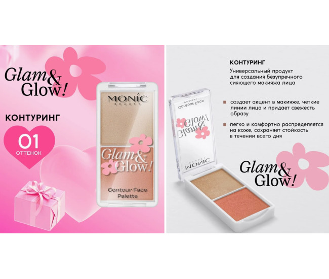 | Наименование | Контуринг MONIC BEAUTY "Glam&Glow! Contour Face Palette 01 Passionate хайлайтер+румяна 2201 |