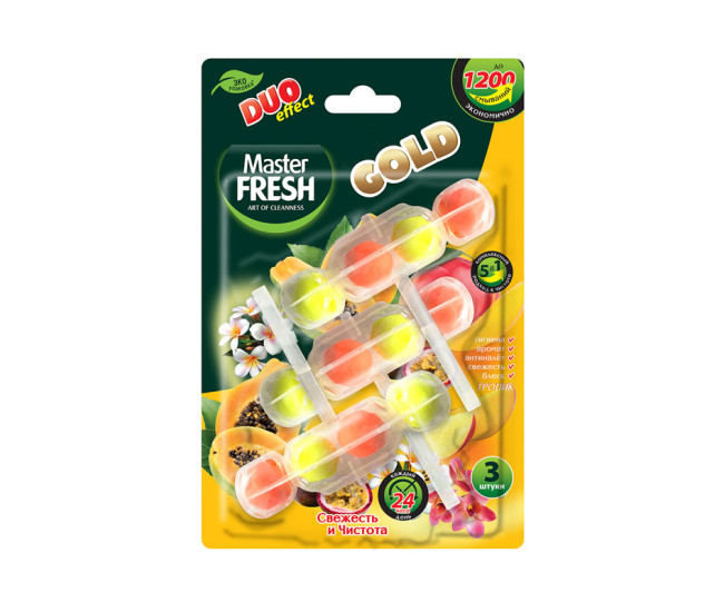 | Наименование | Подвесной блок д/унитазаMaster FRESH GOLD DUO EFFECT 5в1 ТРОПИК, 3шт*24 2055 |