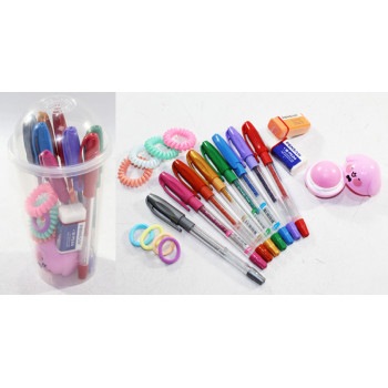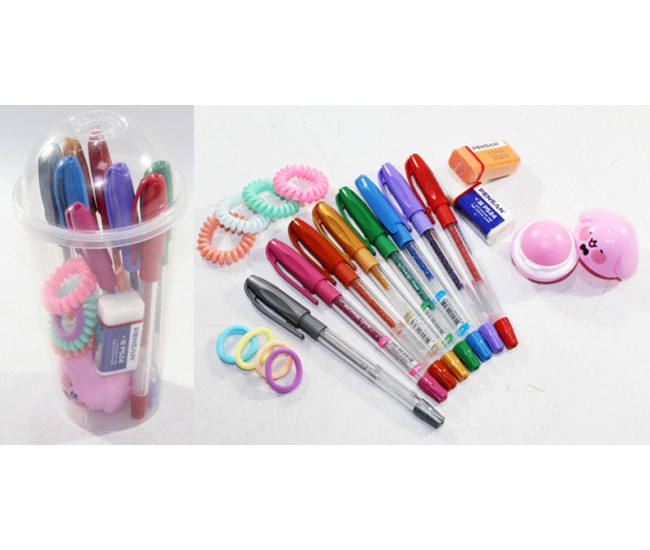 | Наименование | Набор подарочный д/девочки в стакане Круглый (ручки цв,резинки,помад гигиенич,ластик) Без этикетки |