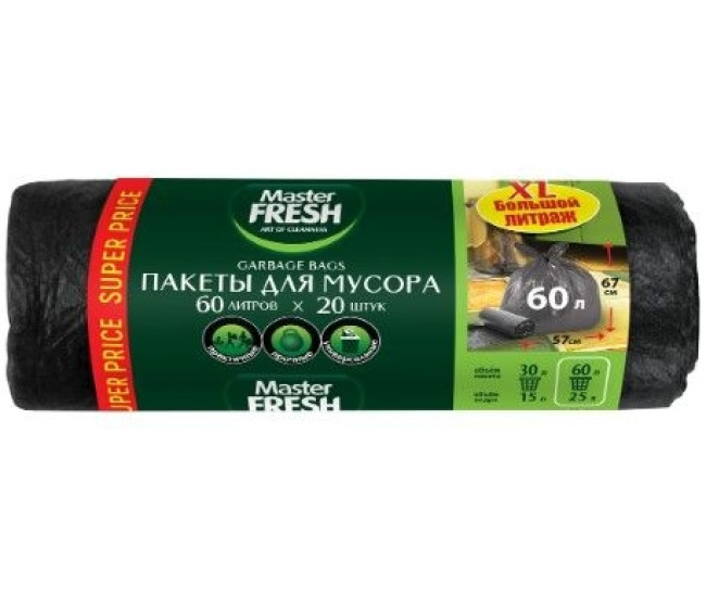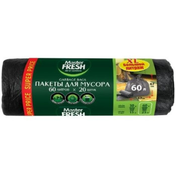 | Наименование | Пакеты д/мусора Master FRESH 60 литров, 20 штук (ЧЕРНЫЕ) 9мкм *50 0182 |