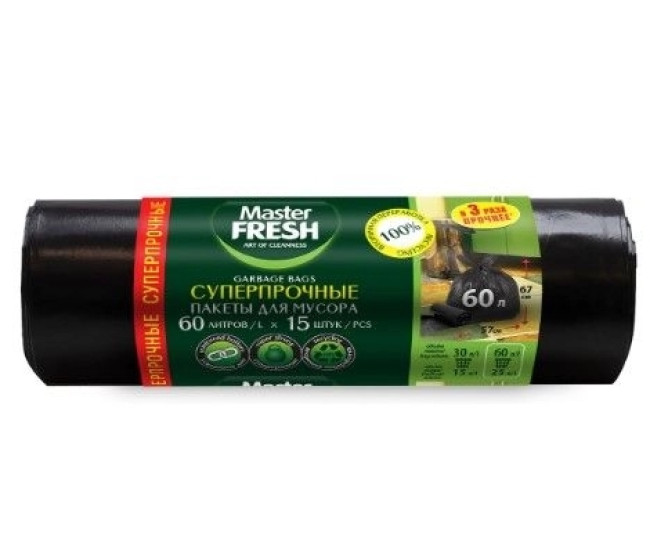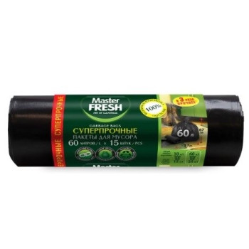 | Наименование | Пакеты д/мусора Master FRESH суперпрочные 60л, 15шт (ЧЕРНЫЕ) 25мкм усиленное дно*20 0068 |